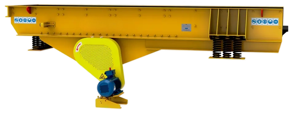These feeders feature a built-in grizzly section at the discharge end to remove fines and undersized rock before primary crushing, reducing wear and improving efficiency across the entire processing line. The vibrating unit consists of two contra-rotating forged steel eccentric shafts, precision-machined and supported by large spherical roller bearings. Flow-through oil lubrication and multi-layer bearing sealing provide extended service life even in dusty and abrasive environments.